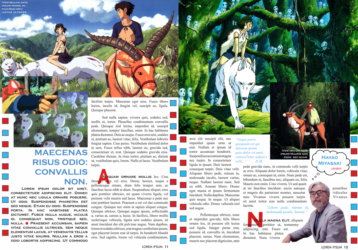 Design experiment: magazine spread layout for an article about the film Princess Mononoke